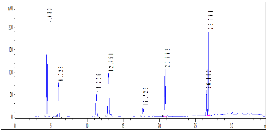 圖1.8種抗氧化劑標(biāo)準(zhǔn)溶液液相色譜圖